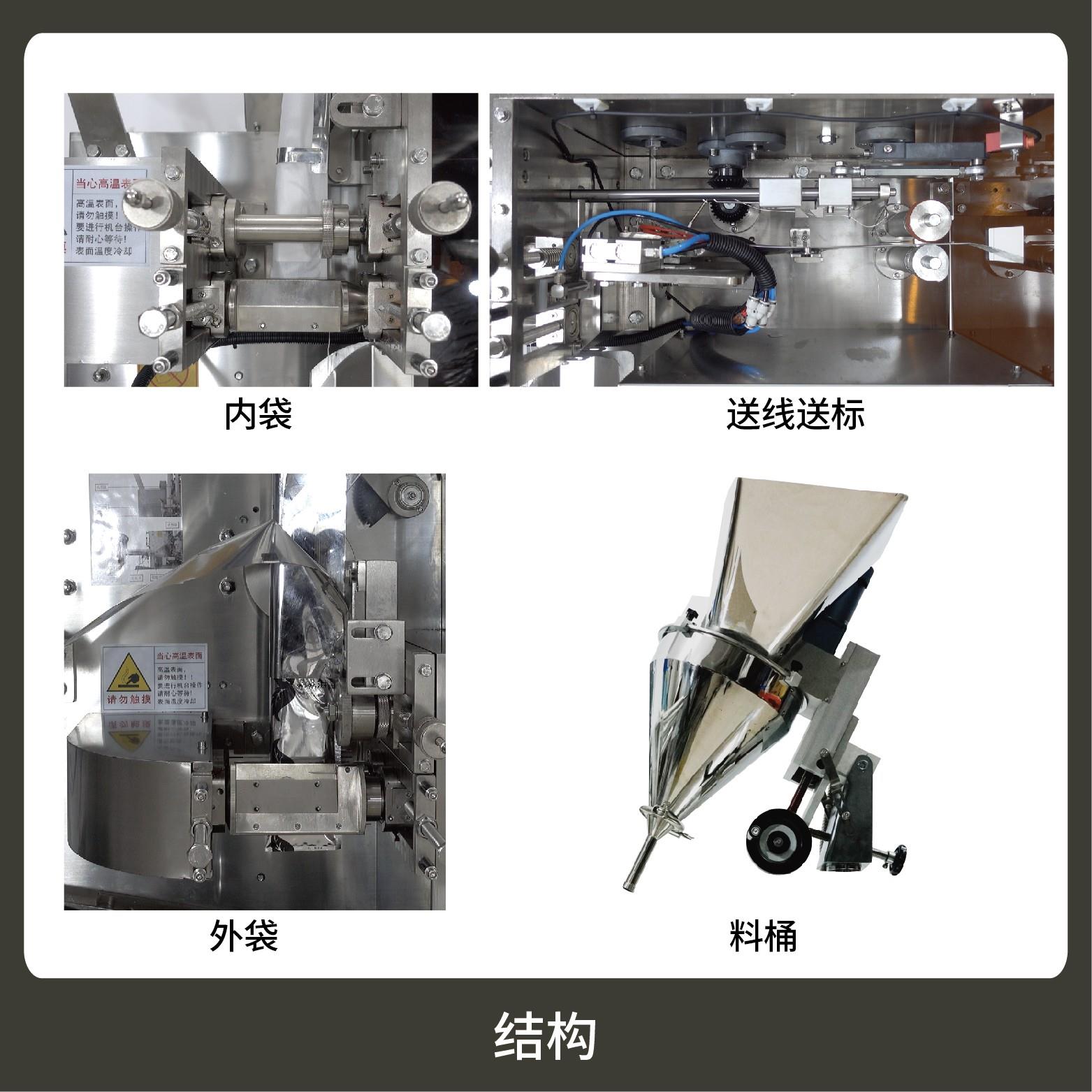 適用于茶葉、藥茶、保健茶草根類等小顆粒物的內(nèi)外袋一次性包裝。